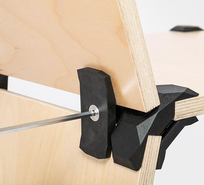 Solide et résistant, adapté à un usage intérieur et extérieur, le connecteur est équipé d'une vis en acier inoxydable qui, lorsqu'elle est serrée ou desserrée à l'aide d'une clé Allen, serre les panneaux comme une pince, évitant ainsi la perforation des panneaux et l'utilisation d'une perceuse ou d'un tournevis. Ainsi, les meubles peuvent être montés et démontés en une minute, et ils peuvent être modifiés et redessinés aussi souvent que souhaité.