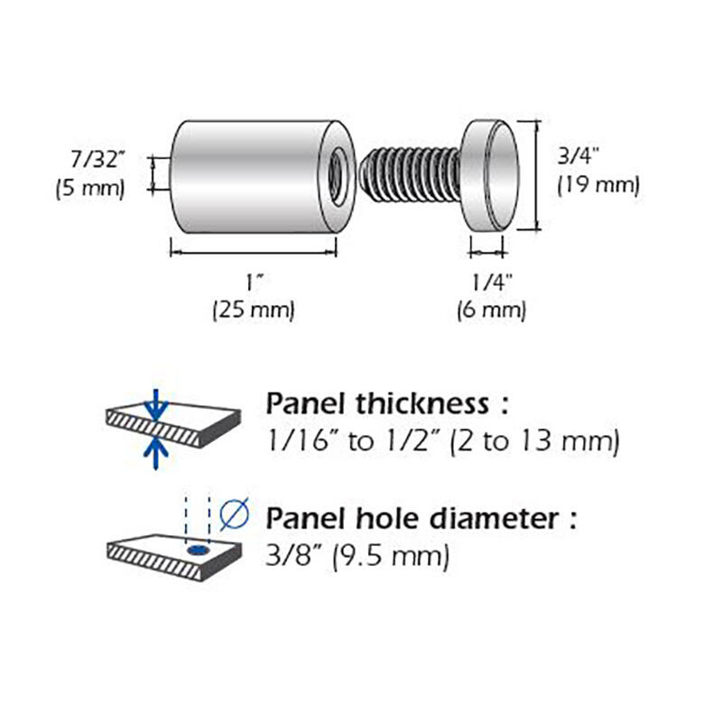 Les Entretoises Murales (Filetées) fournies par Mustang Systems sont fabriquées en aluminium avec une finition anodisé. La fixation murale vissée (entretoise) est livré avec 2 rondelles en silicone et idéale pour fixer un panneau de verre.