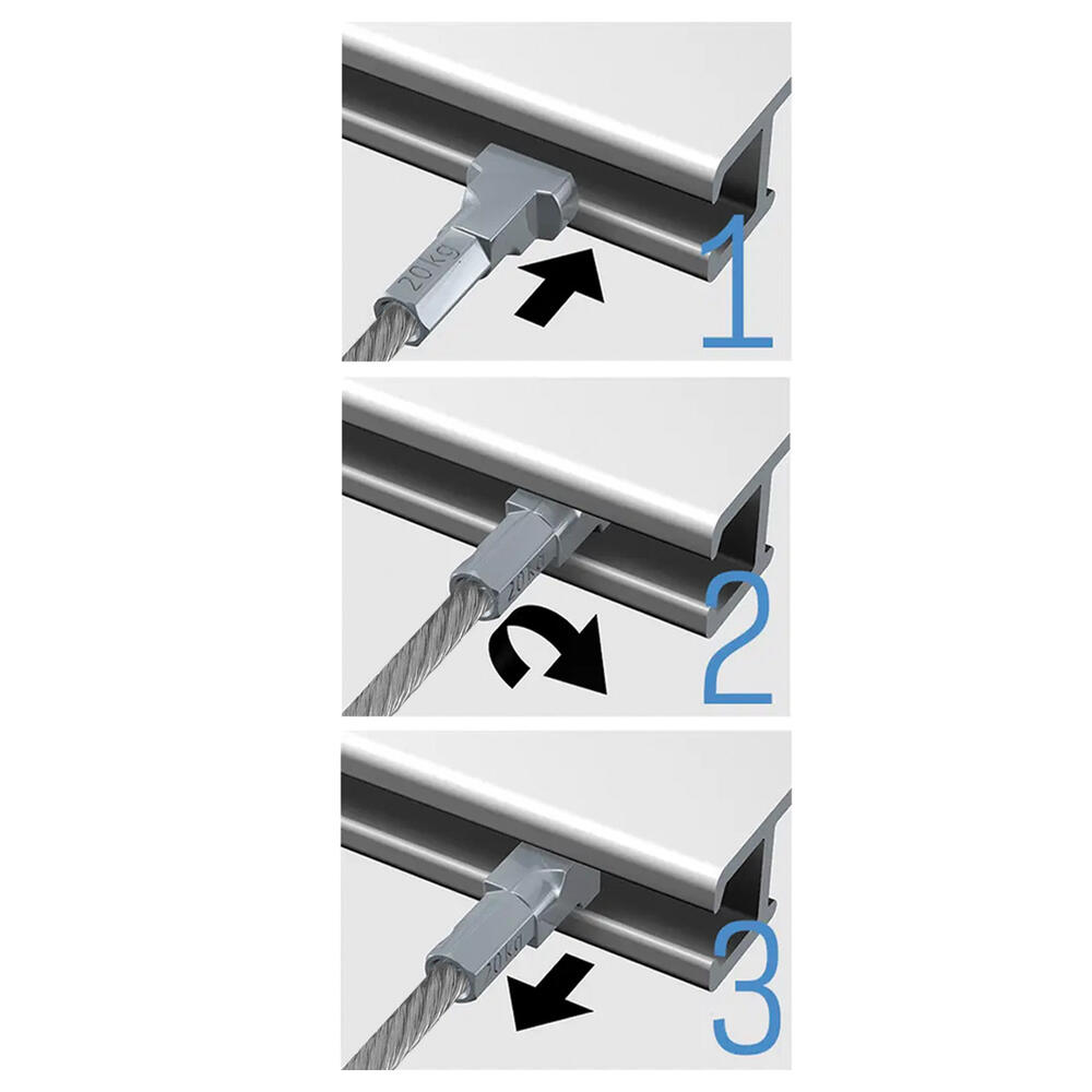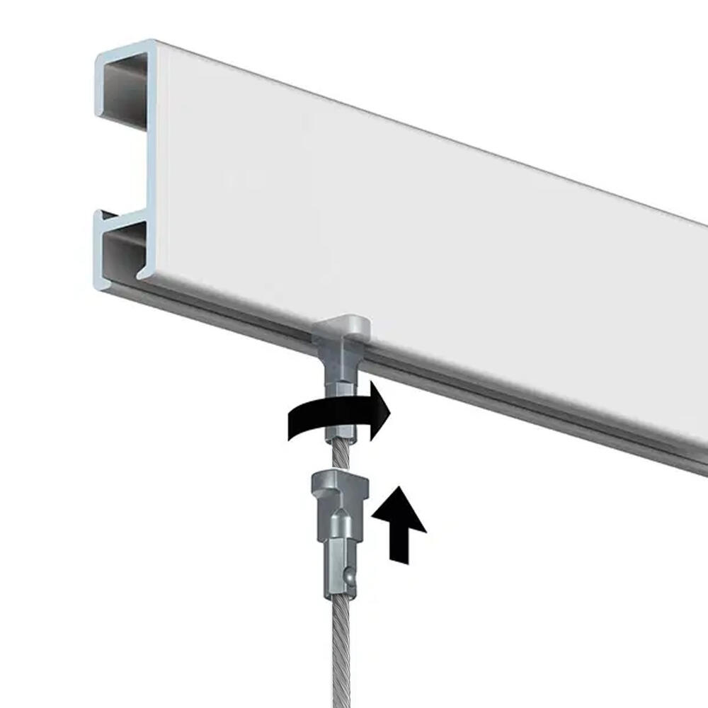 Le système de suspension Twister est compatible avec tous les rails suspendus. Twister propose une méthode simple et intuitive pour fixer le câble au rail : il suffit de tourner, cliquer, et c’est prêt. Grâce à sa capacité à se fixer n'importe où sur le rail, vous pouvez accrocher vos tableaux où bon vous semble sur le mur.