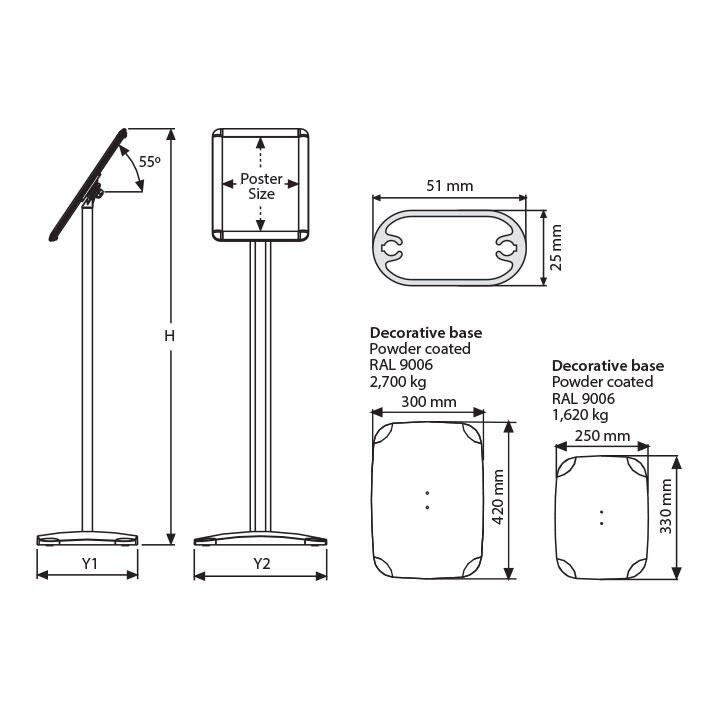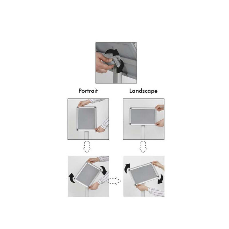 Le Porte Menu Incliné sur Pied fourni par Mustang Systems est idéal pour les salons, expositions ou show-room. Le support est réversible en mode portrait et paysage.